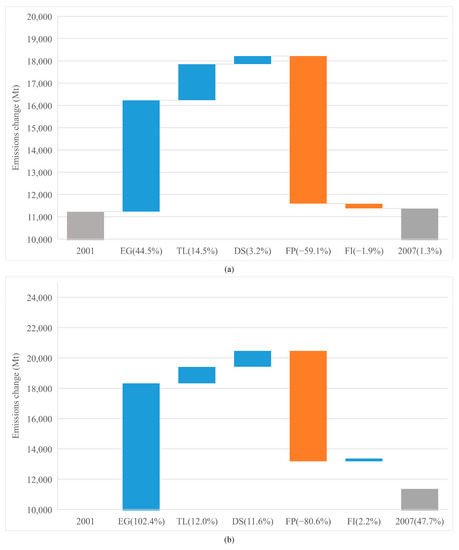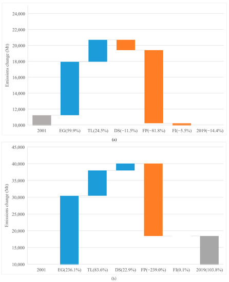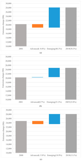 The overall emission changes are shown in Figure 1. The contributions of two country groups are shown in Figure 2: the left gray bar illustrates CO2 emissions in a benchmark year and the right gray bar means emissions in the final year; the change from the benchmark year to the final year is represented by the bars in the middle; the values in brackets represent the growth rate of CO2 emissions compared to the benchmark year. The Figure 1 and Figure 2a indicate that the CO2 emissions accumulation from 2001 to 2019 is mainly from emerging economies (46.3%), while the advanced economies experienced a gentle reduction (−8.0%) in their CO2 emissions.