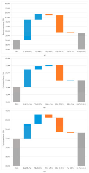It is necessary to explore what drives overall CO2 emissions, especially after the 2008 financial crisis. Figure 3 depicts impacts of the various drivers on overall CO2 emissions during different periods. From Figure 3a, we see that EG was the primary driver (109.1%) of emissions. TL was another contributor to emissions, although its effect is much smaller (29.6%) than the GDP, and the research hypothesis H1 is supported. This is consistent with [33], which states that “when hit by a debt crisis, a country experiences a rise in emissions stemming from either energy related activities or industrial processes”. However, this is inconsistent with [61], which argues that “stock markets and debt decrease CO2 emissions, in high-regimes of economic growth and debt.” Without lessening the FP, the overall CO2 emissions would have been 93% higher than that were observed. This means that the share of fossils in primary energy consumption via private debt financing has seen a significant low-carbon transformation. Further, the change in DS indicates that the deleverage of the private sector in the past two decades has played a helpful role in emission mitigation (−5.9%). Despite the development of low-carbon technologies, changes in FI do not make substantial contributions to lower CO2 emissions (−1.3%); the low-carbon mode after 2008 cannot completely counteract the outcome of the high-carbon development before 2008.