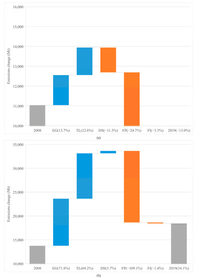 Drivers of emission changes in the different economies from 2008 to 2019. (a) Drivers of emission changes in the advanced economies. (b) Drivers of emission changes in the emerging economies.