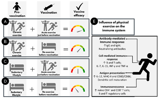 How acute and chronic physical exercise could interfere with immune system and vaccine efficacy, based on published studies. (A) subjects who exercise regularly and performed acute exercise just before vaccination; (B) subjects who exercise regularly and did not perform acute exercise just before vaccination; (C) subjects with a sedentary lifestyle who performed acute exercise just before vaccination; (D) subjects with a sedentary lifestyle who did not perform acute exercise just before vaccination. (E) List of main influences of physical exercise on immune system. Pre-vaccination is defined as days or months before vaccination; vaccination is defined as the moment of injection; chronic exercise is defined as a regular physical exercise in months or years; acute exercise is defined as moderate/vigorous physical exercise a few minutes or hours before vaccination.