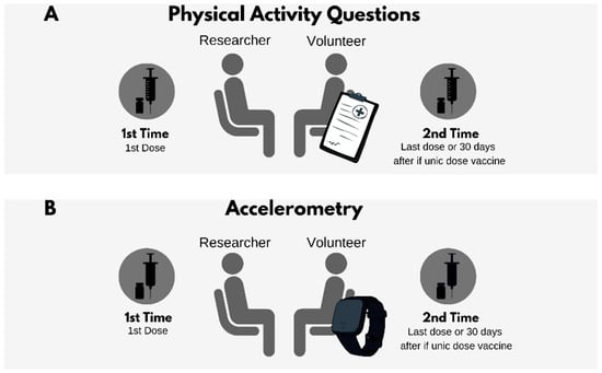 Proposed model for analyzing physical activity level among volunteers with indirect (questionnaire) or direct (accelerometer) method in clinical trials for vaccines. (A) Assessment of volunteer’s level of physical activity by questionnaire. Researcher should apply the same questionnaire at least twice: at first dose and same day as last dose. (B) Evaluation of physical activity level by accelerometry. Researcher should proceed similarly to questionnaire method. If vaccine is single dose, second assessment of both cases must be carried out 30 days later. Accelerometer assessment requires several days.