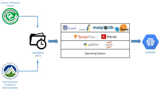 The specific environment is required to provide machine learning experiments. The dataset of air pollutants, ILI, and respiratory disease are trained using ARIMA and LSTM. TensorFlow’s deep learning library was used to train air quality and disease history integration data. The library used Numpy and Pandas to process data manipulation and preprocessing. Matplotlib was used to visualize real and predictive information. Scikit-learn applied to evaluate the model’s accuracy. Figure 1 describes the architecture of the environmental scheme used in the project.