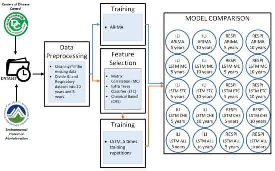 The influenza-like illness and respiratory disease were predicted by comparative models of ARIMA and LSTM for 5 and 10 year periods. While ARIMA captured a variety of typical temporal structures of the diseases that change over time in the training model, LSTM carried out some feature selection techniques, including matrix correlation, extra trees classifier, and chemical-based before training input data. As a result, three LSTM-based training types were formed, two of which selected the top five highest-ranking data. The remaining type, chemical-based, used four parameters, which are the main contributors to the diseases. Thus, the study conducted comparisons of the disease’s prediction between ARIMA, ordinary LSTM, and three LSTM models associated with feature selection techniques during five years and ten years. As a result, there is a highly consistent trend of the prediction models for ILI and respiratory cases. Besides, all four LSTM prediction models present a higher accuracy than ARIMA’s outcome in both 5 and 10 year periods of ILI and respiratory diseases. Comparing two periods of time, the prediction model of ARIMA for five years is more accurate than one for ten years, whereas the ten-year prediction models using LSTM got the opposite result, the result of ten-year prediction models reach a higher accuracy than five-year models’. Among the four LSTM-based models, the matrix correlation technique’s outcomes achieve the most accuracy, and chemical-based feature selection is also a promising approach. The chemical-based show is not much different from the matrix correlation’s results, and its four selected factors are based on fundamental knowledge.