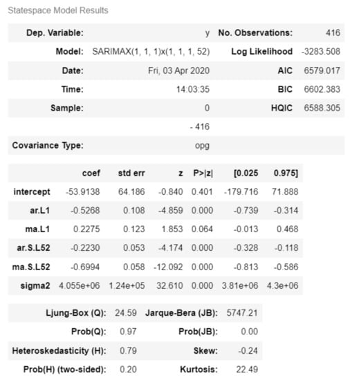 Figure 3 describes the SARIMAX(1, 1, 1) × (1, 1, 1, 52) configuration was identified as the most optimal for modeling the time series based on the lowest AIC.