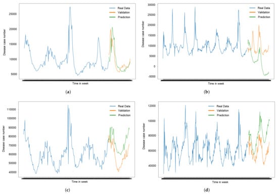The following tables describe the actual data compared to validation and prediction. The blue line represented the real data used for the training. The orange line is the validation for the forecast, and the green line shows the prediction of the validation data. It can be seen from the graph’s trends, The trend’s line in Figure 5a has the closed prediction compared to Figure 5b–d. It is because of the model in Figure 5a has smallest RMSE value.