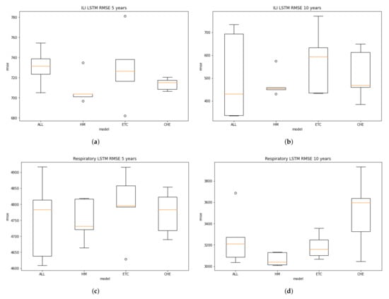 The bloxplot prediction distribution in 5 times repetitions. (a) ILI LSTM boxplot from 5 years dataset training; (b) ILI LSTM boxplot from 10 years dataset training; (c) Respiratory LSTM boxplot from 5 years dataset training; (d) Respiratory LSTM boxplot from 10 years dataset training.
