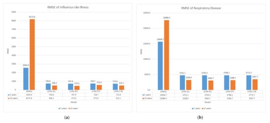 The model comparison results in graphs. (a) The RMSE of Influenza-like Illness; (b) The RMSE of Respiratory Disease.