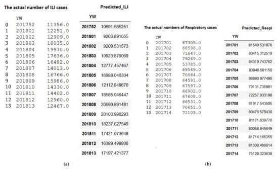The Prediction sampling of ARIMA. (a) ARIMA ILI 5 years; (b) ARIMA Respiratory 10 years.