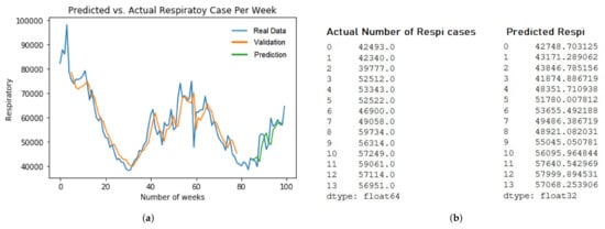 Respiratory LSTM sampling predictions. (a) Respiratory LSTM ALL model for 5 years dataset training; (b) The Prediction Result of LSTM ALL 5 years.