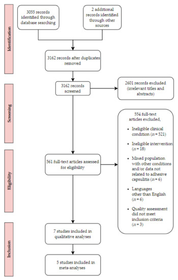 After removing duplicates, 3055 records remained from which 2494 articles were further excluded due to the lack of relevancy upon the review of article titles. In addition, 561 articles were assessed through the review of article titles and abstracts. Furthermore, 551 articles were excluded since they did not meet eligibility criteria for participant characteristics, intervention types, or clinical disease conditions. Ten trials were selected with our inclusion criteria, but three trials did not meet our quality assessment criteria [29,30,31]. A total of seven trials were finally included for this systematic review and meta-analysis [23,24,32,33,34,35,36]. Specifically, seven trials were included for pain measurement using VAS. In the range of motion measurement, six trials for abduction and flexion were included. Five trials for internal rotation and external rotation were also included. Three trials were included for disability score. A flow diagram is presented in Figure 1.