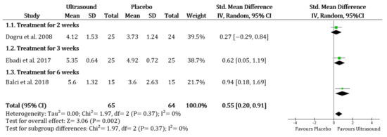 The main finding of the study is that UST compared to placebo is an effective intervention when carried out with exercise and/or other physical modalities. Dogru et al. [34] reported that the UST group showed greater improvement in FL, IR, and ER than the sham UST group without any difference in pain improvement between groups. However, one drawback of the study was that both groups had different baseline mobility (i.e., ROM) scores, and the compliance rate for the home exercise programs was also different between the groups, which may have greatly influenced the results. Similarly, Ebadi et al. [35] and Balci et al. [24] found no evidence that UST has additional effects along with exercise or other physical modalities. Interestingly, after normalizing the point of measurements and treatment duration, the present study found significant pain improvements in the UST group compared to the sham UST group. This finding is similar to the previous study that UST effectively reduced pain compared to cryotherapy in patients with ACS [33].