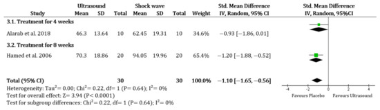 Comparing UST to placebo, there was no evidence that the UST was more effective for improvement of ABD (SMD 0.26, 95% CI −0.54 to 1.05; I2 = 79%), FL (SMD −0.14, 95% CI −1.11 to 0.84; I2 = 86%), IR (SMD −0.22, 95% CI −0.56 to 0.13; I2 = 0%) and ER (SMD −0.47, 95% CI −1.04 to 0.09; I2 = 59%). There was also no evidence that the UST was more effective than the shock wave therapy or the improvement of ABD (SMD –0.17, 95% CI −1.22 to 0.88; I2 = 72%), IR (only based on Alarab et al. [32]), and ER (only based on Hamed and El-Rahman [36]). However, there was a more significant change in shock wave therapy for FL (SMD −1.10, 95% CI −1.65 to −0.56; I2 = 0%) (Figure 3). There was no significant difference when comparing the UST group to the corticosteroid injection group or the platelet-rich plasma injection in all ROM (only based on Kothari et al. [23]).