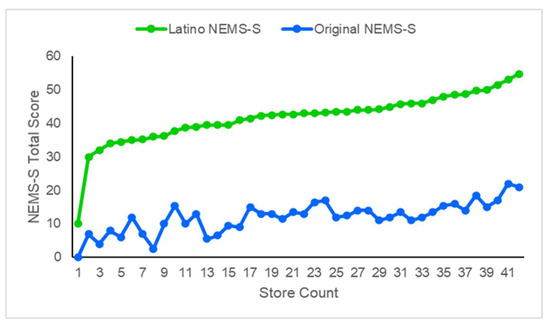Latino NEMS-S and original NEMS-S total scores for each tienda (n = 42).