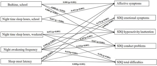 Longer sleep onset latency was significantly associated with four outcomes (i.e., all mental health outcomes except for SDQ hyperactivity/inattention), which were also consistent with the regression analyses. There was some difference between the linear regression and the path analysis results. In the linear regression analysis, longer sleep onset latency was associated with four outcomes, including affective symptoms, SDQ emotional problems, SDQ conduct problems, and SDQ total difficulties. However, in the path analysis, longer sleep onset latency was associated with three outcomes, including affective symptoms, SDQ emotional symptoms, and SDQ total difficulties, but not with SDQ conduct problems.