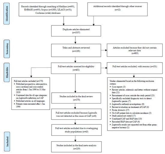 The exclusion criteria were as follows. (a) Studies addressing other aspects of CAP, such as hospital-acquired pneumonia (HAP), that is, patients with pneumonia occurring 48 h or more after hospital admission. Hospitalized patients with a diagnosis of ventilator-associated pneumonia were also excluded. However, in circumstances where studies reported results containing both CAP and HAP data [,,,,] only Legionellosis data specific to CAP was included in the meta-analysis. (b) Poster abstracts, brief communications, case reports, cases series, reviews/evaluations, editorials, correspondence without original data and laboratory-based studies of CAP (c) studies, which recruited CAP patients pre 1 January 1990. (d) Study period not stated. (e) The etiological role of Legionella was not included in the study design []. The complete search strategy is detailed in the Supplementary Appendix. Available gray literature, which predominantly comprised of national and jurisdictional reports describing the routine treatment and management of CAP, was not considered as useful for our review.