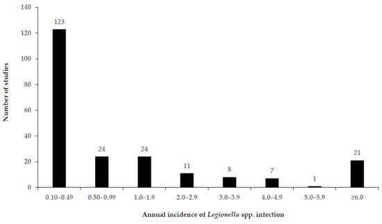The knowledge of pathogens causing CAP is important for the selection of antimicrobial treatment []. Despite the differences in geographic location, patient population and laboratory methods applied, this systematic review with meta-analysis represents a synthesis of published CAP etiology studies revealing several important findings: (i) Legionella spp. were found to be a common bacterial etiology of CAP (4.6%: 95% CI 4.4–4.7). (ii) The annual incidence of Legionella infection, in spite of its global diffusion, was highly variable in different studies (Figure 3). This present study provides an estimate of the mean incidence of Legionella infection in CAP, which could be used to estimate the global public health burden of LD to support improved prevention and management interventions. (iii) L. pneumophila was identified as an important agent for severe CAP after S. pneumoniae. This result is in line with global findings [,,,], although one study found no L. pneumophila positive cases among 373 patients but detected L. longbeachae infection in 3.8% of patients using serology and PCR [].