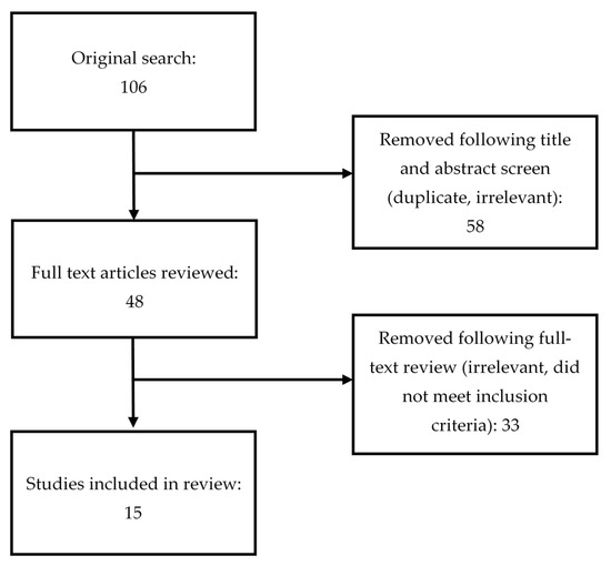 The initial search yielded 106 articles. After removal of duplicates, 48 original articles remained. Full text of all resulting papers were reviewed for further assessment, and another 33 were excluded because they did not meet the inclusion criteria, leaving 15 studies for inclusion in this review (see Figure 1). Table 1 provides a detailed description of each study in terms of country, the sample, the aim of the study, main outcome measures, findings, results, and conclusions.