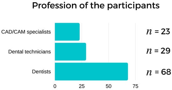Our feedback came mainly from dentists (n = 68), dental technicians (n = 29), and CAD/CAM specialists (n = 23) (Figure 2.). The participants had an average of 3.8 years (±0.7) of experience in the 3D printing field and owned a total of 405 printing devices (3.6 on average/person).