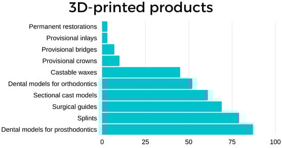 Regarding their use (Figure 3), most of the respondents commonly used their devices to create dental models for designing prosthodontics (n = 87), orthodontics (n = 52), sectional cast models (n = 61), surgical guides (n = 69), castable waxes (n = 45), splints (n = 79), and provisional restorations (n = 17), including dental bridges (n = 7), crowns (n = 7) and inlays (n = 3) and, occasionally, permanent restorations (n = 3).