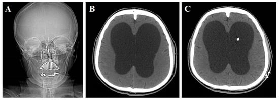 Evans’ index, head circumference, the presence of obliterated cortical sulci, the aqueductal stenosis, and an expanded/destroyed sella turcica were assessed on preoperative MRI. In addition, two neurosurgeons independently assessed the presence of a disproportionately enlarged subarachnoid space hydrocephalus (DESH) [], the callosal angle, and an enlarged cisterna magna measuring 10 mm or more on midsagittal images on preoperative MRI []. The images of each patient were analyzed using RadiAnt DICOM Viewer (version 2021.2, Medixant, Poznań, Poland), downloadable at https://www.radiantviewer.com, accessed on 25 January 2022), using the multiplanar reconstruction button. We used sets of DICOM images containing at least 64 slices.