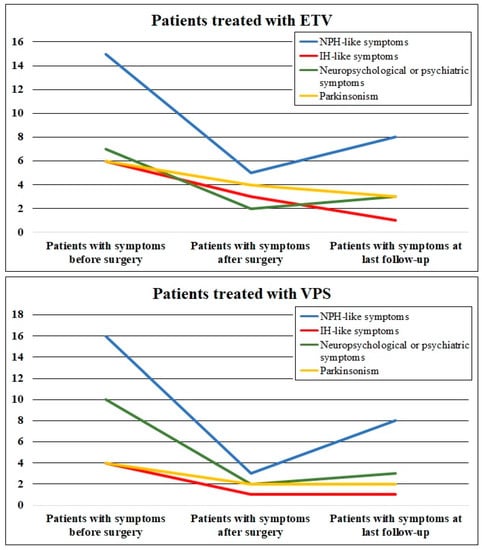 The clinical onset of LOVA can occur at any stage in adulthood, with a range between 22 and 81 years [,,]. In our series, the overall median age of patients at the time of diagnosis was 64 (IQR: 54.5–74), whereas the median age of patients treated with ETV or with VPS at first was 59 (IQR: 52.5–67) and 66.5 (IQR: 61–76), respectively. These data are similar to previous studies [,,,] which reported a lower age in patients treated with ETV, probably due to the attitude to avoid a shunt dependency in younger patients. Al-Jumaily et al. [] and Ved and al. [] identified headaches and imbalance as the most common features in LOVA. Several studies [,,,] demonstrated that a majority of LOVA patients can achieve postoperative clinical improvement in headaches, dementia, motor skills, and neuropsychological or psychiatric disorders after ETV, as our study confirms. In our series, NPH-like preoperative symptoms were found in all patients. NPH-like symptoms were reported in only 51.6% of patients at last follow-up, with no statistically significant differences between the two groups of patients (p = 0.05).