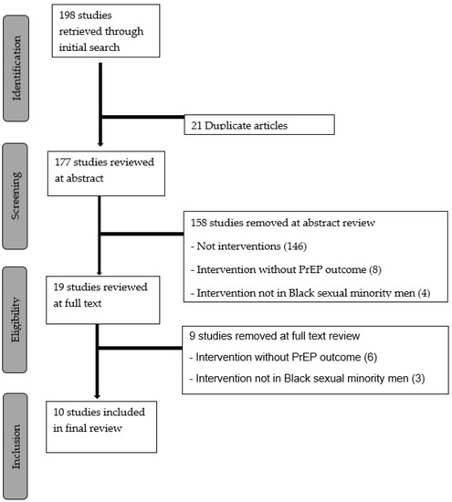 Of the starting total 198 articles, 21 were excluded as duplicates, and 158 were excluded based on the abstract (Figure 1). Articles were excluded based on the abstract if it was evident that they were not interventions focused on PrEP. Of the 19 articles reviewed at full text, 10 were included in the final review [36,37,38,39,40,41,42,43,44,45]. The most common reason for studies being excluded after reviewing the full texts was not having a measured PrEP outcome. All studies included had a low potential for bias based on our bias assessments (Supplement Table S1).