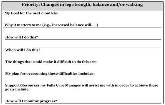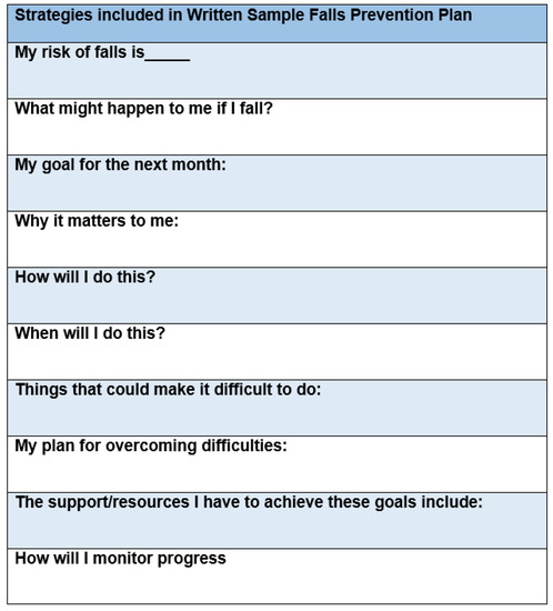 - Haas, R.; Mason, W.; Haines, T.P. Difficulties Experienced in Setting and Achieving Goals by Participants of a Falls Prevention Programme: A Mixed-Methods Evaluation. Physiother. Can. 2014, 66, 413–422. [Google Scholar] [CrossRef] [Green Version]