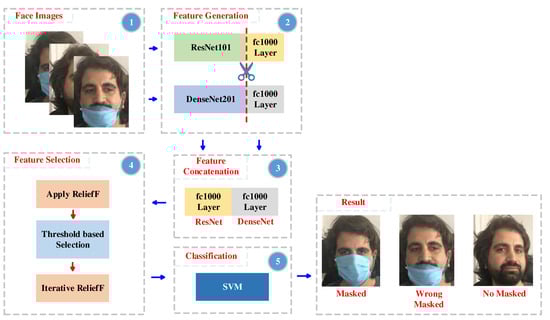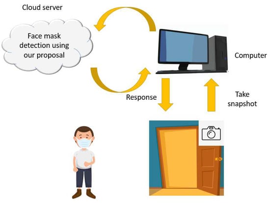 The presented deep feature engineering-based face mask wearing detection application can be used in medical centers and other locations to detect violations of face covering rules. A camera can be placed on the door, and this camera can take a picture of a person’s face that depicts the front profile. That picture can be processed with the presented hybrid deep model. The processing results will indicate possible violations of face covering rules. Deploying such a system will automate and objectify the detection aspect of face covering rule enforcement. A schematic demonstration of our project is shown in Figure 9.