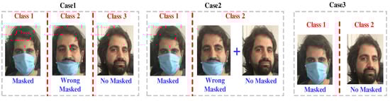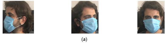 In this study, photographs of individuals mask (Case 1), no mask (Case 2), and improper mask (Case 3) were collected by researchers via internet search. The discovered photos were combined with 4072 photos that were uploaded to the Kaggle website by Larxel []. A face detection application was created to obtain face images from all the photos in the database. There may be more than one photo of the same individual in the database. This program, coded in C# language, detected automatically faces from photos. Through visual inspection, we eliminated a few low-quality face-mask images. Finally, we collected 529 improper mask, 992 mask, and 554 no mask face images. To explain the used classes, Figure 2 shows example images for each of the three classes.