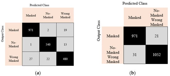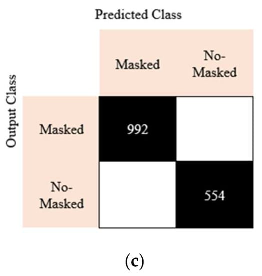 Machine learning is a powerful technique used for automatic feature extraction [,,,]. Many machine learning techniques have been presented in the literature for the detection of different diseases [,,,,]. Machine learning techniques, developed especially for the early diagnosis of COVID-19, have achieved successful results [,]. Moreover, deep learning models are the most widely used techniques to detect COVID-19, since they are better solutions for COVID-19 classification than feature engineering models [,]. Deep learning methods achieved high accuracy when sufficient labeled data was available. Thus, deep learning-based automatic diagnosis systems are of great interest in cases when human expertise is not accessible []. Such systems can also serve as adjunct tools to be used by clinicians to confirm their findings. Machine learning methods have been used to detect face masks automatically [,]. A wide range of deep learning models, especially convolutional neural networks (CNNs) [,], were used to solve computer vision problems. As such, deep learning models are state-of-the-art networks in artificial intelligence, and they are likely to yield high classification performance, even with large datasets. Table 1 presents a selection of recent studies conducted to address the face mask detection problem.