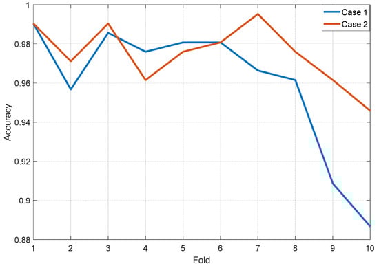 In Figure 7, fold-wise classification accuracies of Case 3 were not depicted since our model has attained 100% classification accuracy on that case. Thus, fold-wise accuracies of Case 3 are equal, and they are 100%.
