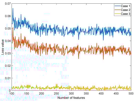 Graph of loss value versus number of features using TRFIRF selector for Case 1, Case 2, and Case 3.