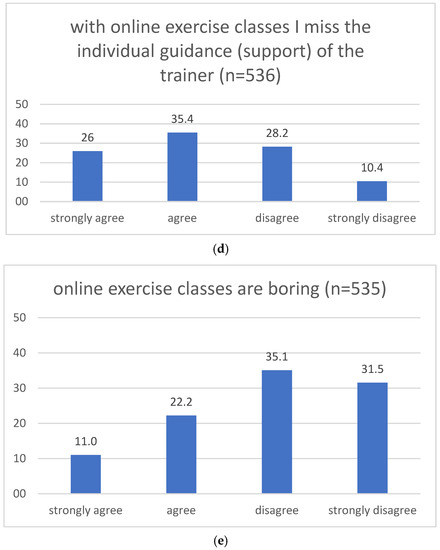 Users’ opinions towards OECs in % (‘time flexibility’ (a), ‘self-motivation’ (b), ‘social interaction’ (c), ‘individual trainer guidance’ (d), and ‘boringness’ (e)).