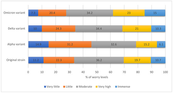 The HCWs’ perceived worry levels from various SARS-CoV-2 variants *. * Worries from original, alpha and delta strains were significantly lower than the worries from Omicron (paired samples t-test, p < 0.001 each, respectively).