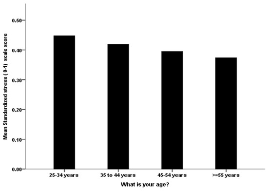 The association between the HCW’s age group with their mean perceived standardized stress score.