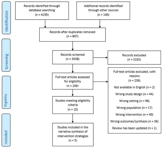 The database search returned 4195 citations, with an additional 140 records located in PROSPERO. After the duplicates were removed, 3438 title/abstracts were screened. A total of 246 citations underwent full-text review. Ten systematic reviews which met the eligibility criteria following full-text screening were identified. The reasons for exclusion are provided in Figure 1. Of the 10 included reviews, five were selected as the most recently published, highest-quality review for at least one intervention strategy and, therefore, were included in our narrative synthesis of intervention strategies [23,24,25,26,27].