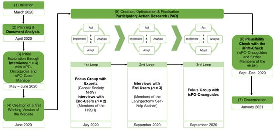In isPO’s early implementation phase, service providers and patients reported that the initially developed PIM were linguistically inappropriate, too exhaustive, and partly redundant []. The isPO project was represented on the Centre for Integrated Care of the University Hospital of Cologne (CIO) website. However, the information provided was useful for other researchers or funders, but not preliminary for patients. These shortcomings led to poor programme acceptance and low participant recruitment. Hence, the optimisation of the isPO PIM was needed, and as such was conducted between October 2019–February 2020. It resulted in four high-quality PIM, namely, a poster, leaflet, patient folder, and one-pager, that were introduced in practice in 03/2020 [,]. The PHR approach [] was applied for the PIM optimisation process, whereby three groups contributed as co-researchers: end-users (former cancer patients), health professionals, and service providers. During the optimisation process, the need for a fifth element—a patient-friendly website—was identified. However, due to resource bottlenecks, this element was separately developed within a Master’s qualification (first author JR) and is the focus of this paper.