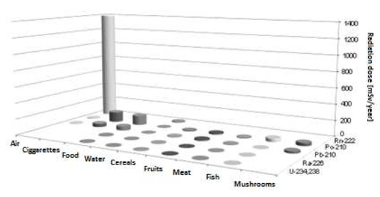 The research results presented in the paper showed that an adult Polish resident receives about an annual effective dose of 309 µSv of 210Po and 210Pb from inhalation and ingestion. The main source of both radionuclides in the body is smoking. This indicates that cigarettes and marijuana hash smoking and their absorption through the respiratory system are the main sources and the principal intake pathway of 210Po and 210Pb by Polish smokers. Cigarette and marijuana hash smoking could be the reason for the high incidence of cancer of all organs of the respiratory system in the Polish population. In terms of food, the sources of the dose from the tested isotopes are fish, grains, fruit and vegetables and mushrooms. The size of the calculated dose resulting from the decay of 210Po and 210Pb in the body is almost 1/10 of the annual radiation dose received by a Polish inhabitant from natural sources (2.8 mSv) and is almost five times lower than the dose resulting from the inhalation of 222Rn radon.