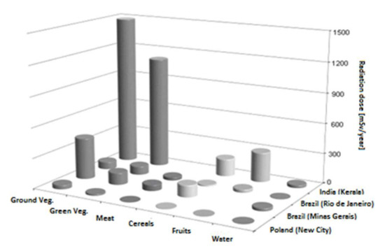 The example of food showed that both the content of natural radionuclides in the soil and the eating habits of the local population have a direct impact on the amount of radioactive isotopes consumed through food. In some regions of India (Kerala), Iran (Ramsar) or Brazil (Minas Gerais), where the earth’s substance contains deposits rich in radium, uranium and thorium, food products contain increased 238U, 232Th, 226Ra, 210Pb and 210Po activity. This is confirmed by the large radiation doses received by consumers of ground and green vegetables in Kerala (above 0.9 Sv/y) and Minas Gerais (above 0.1 Sv/y) (Figure 2) [3,33,35,41].