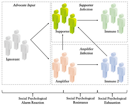 Concerning the diffusion trend of network rumors, most of the work is still based on the traditional concept of information security, ignoring the complex psychological factors behind the gossip. Many scholars tend to consider the dynamic evolution process of public rumor engagement as three (i.e., induction, diffusion, and regression) [14] or four (latent, outbreak, stability, and dissipation) objective stages [15]. Few studies have observed the role differences of rumor engagers and systematically captured the infectious law that individuals are assimilated from the ignorant to the engagers (transforming among different types of engagers) and the engagers return to the immune.