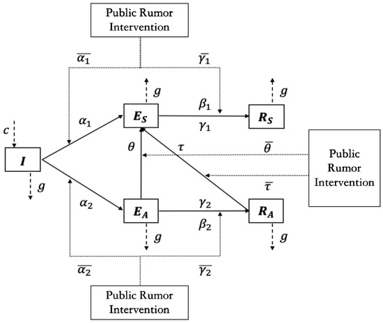 Moreover, considering that the social network management department may intervene rumor engagement in three key social psychological stress stages, it can guide and control the evolution of the situation of the rumors. Specifically, the I2S2R interactive infection model of multiple rumor engagers under different kinds of intervention modes is shown in Figure 2, and the meanings of parameters in the model are shown in Table 2.