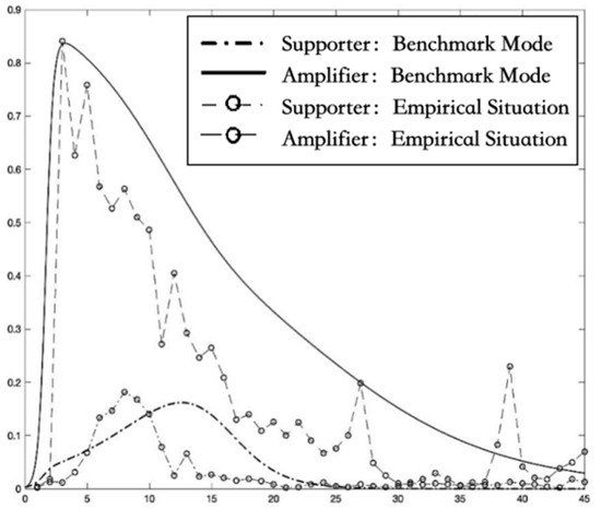 The curves of the density of supporters and amplifiers over time under the empirical situation and benchmark mode.