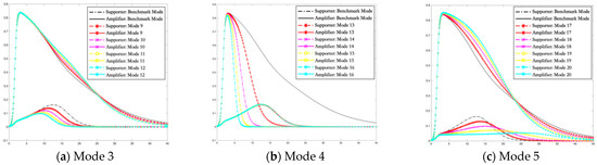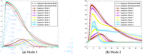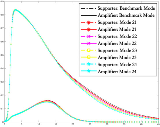Figure 5a shows that, in the case of mode 1, compared with the benchmark model, in the period of social psychological alarm reaction, the hindering intervention in the transformation from ignorant to deviant supporter can delay the time when the number of deviant supporters reaches the peak. It reflects the property of rumor intervention that hindering strategy is more intense; the speed of transmission rate of supporters is slower. However, the total number of supporters does not decrease but the peak value of the number of amplifiers increases significantly overall. Precisely, with increasing intensity of hindering intervention, the peak of the rumor amplifiers is higher and the descent rate to fall back to zero is larger. Therefore, if the crisis management department blocks the deviant supporters in the period of social psychological alarm reaction, it may seem to be conducive to reducing the blind and impulsive content creation of the deviant supporters in the early stage. In essence, it does not completely solve the problem and improve the current situation. Moreover, the direct suppression of deviant supporters will stimulate more deviant amplifiers and pose a greater threat to the stability of the social system. In short, the hindering intervention on the deviant supporters leads to more serious negative consequences in the period of social psychological alarm reaction.