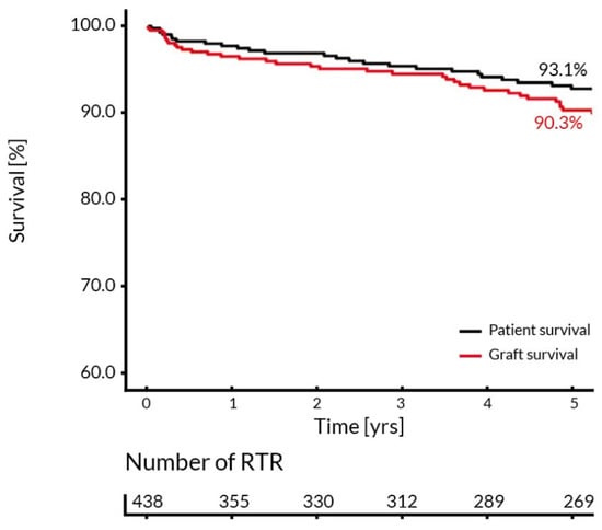 Kaplan–Meier estimates of the 5-year patient and graft survival in the entire studied transplant population.