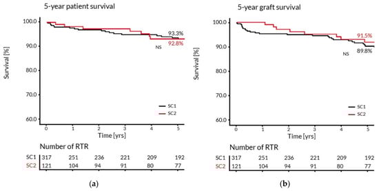 The Kaplan–Meier estimates of the 5-year patient (a) and graft (b) survival in RTR transplanted in two surgical centers (SC1 and SC2).