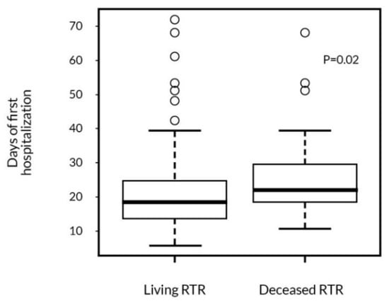 The average length of the peri-transplant hospitalization was 23 (±16) days. It was not statistically different between the two surgical centers: 22 ± 18 vs. 26 ± 11 days. During later post-transplant follow-up, patients were hospitalized 10 days per year on average. Interestingly, 28% of RTR were only hospitalized during their first hospitalization after the KTx. We found a significant association of the first hospitalization length with patient survival. RTR who died during follow-up had a significantly longer peri-transplant hospitalization time (Figure 3).