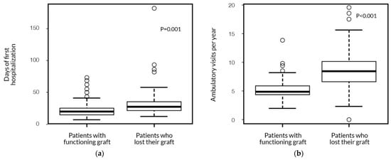 The association of graft survival with the first hospitalization length (a) and with the number of outpatient visits (b) (Mann–Whitney test).