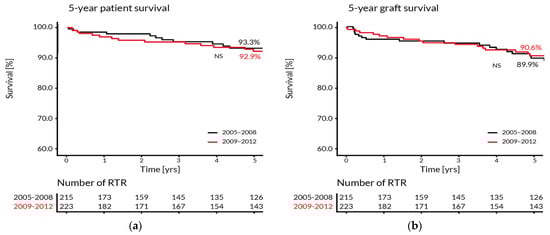 Interestingly, patients with ADPKD required significantly less hospitalization days than RTR with other primary diseases (5.2 vs. 11.8 days per year, p = 0.003). These patients were hospitalized the shortest (5 days per year, on average) and had the least number of outpatient visits (6 visits per year, on average). The average distance from the patient’s place of residence to the transplant center was 186.5 km. The most remote location was 521 km away from the center and only 12.5% of the patients lived in the city where the transplant center is located. However, the distance from the place of residence to the transplant center was neither associated with the patient and graft survival, nor affected the number of outpatient transplant visits per year. The regulation of drug disposal in 2008 determined the reduction of the number of patient visits from 9.6 to 6.6 per year in the periods 2005–2008 and 2009–2012, respectively. Therefore, we compared the 5-year patient and graft survival in both periods and found no significant differences (Figure 5).