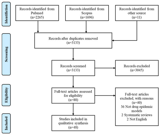 Our search criteria returned 3972 references, of which 3133 were unique records (Figure 1). Among 88 studies with full text assessed for eligibility, 48 articles met the selection criteria and were hence included for analysis. We tabulated the model characteristics and settings in Table 1. 23 of the 48 studies included were based on ODE modeling, 10 adopted PDE models (excluding delayed or stochastic PDE), eight used DDE models, five were SDE models and the remaining two studies took the form of DE models. 13 studies applied their models to real settings or scenarios, either choosing parameters pertaining to local conditions or fitting models to historical data. Among these studies, seven were set in Africa, four in Oceania or North America, one in Europe and one in Asia. In terms of drug type, there were 28 heroin epidemic models, 6 methamphetamine models, four synthetic drug models, two co-infection models and eight unspecified drug epidemic models.