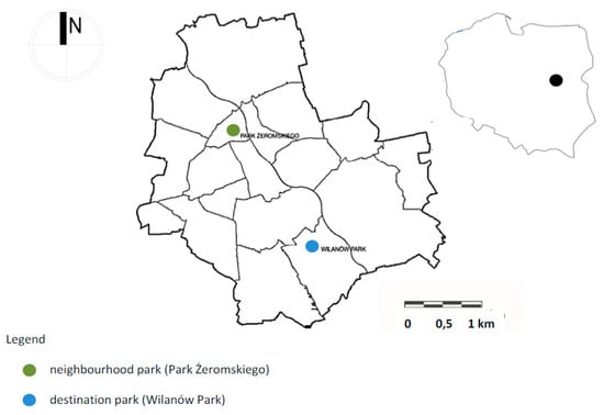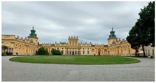 Wilanów Park (Ogród w Wilanowie) is located in Wilanów district, approx. 10 km from the city centre, at the end of the historic Royal Route, leading from the Old Town with the Royal Castle to the Palace in Wilanów [73]. The park is located next to the original suburban residence of King John III Sobieski. It was established in the 2nd half of the 17th century on the common axis with the Palace of Wilanów. It covers 24 ha (45 ha together with Jezioro Wilanowskie (Lake Wilanowskie) and Kanał Sobieskiego (Sobieski Canal)). The 45-hectare complex includes buildings, gardens and parks of various styles: North Garden, Baroque Garden—divided into two terraces, Rose Garden, two landscape parks—the North and South, and the Orangery Garden. In 1965, the park was listed as a historical site in the Warsaw Province, and in 1994, it was recognized by the President of the Republic of Poland as one of the most important sites to Poland’s cultural heritage (Museum of King Jan III’s Palace at Wilanów, 2020). The paid parking area for passenger cars and coaches is located approximately 300 m from the Palace (behind the Post Office building). Wilanów can be reached from the city centre by public transport (buses) (Figure 2). The entrance fee for an adult is ca. 2 euro.